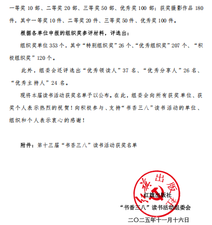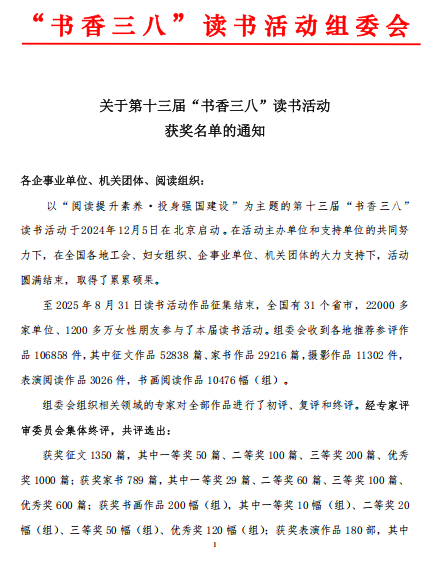 本次读书活动以“阅读提升素养·投身强国建设”为主题,2024年12月5日在北京启动,2025年8月31日结束。在31个省市的工会、妇女组织、企事业单位、机关团体支持下,共有22000多家单位、1200多万女性朋友参与。各地推荐参评作品共106858件,其中征文作品 52838篇、家书作品29216篇、摄影作品11302件、表演阅读作品3026件、书画阅读作品10476 幅(组),相关领域专家对全部作品进行了初评、复评和终评,经专家评审委员会集体终评,共评选出:获奖征文1350篇,表演作品180部,摄影作品180件,获奖书画作品200幅(组),其中书画阅读作品共评出一等奖10幅。