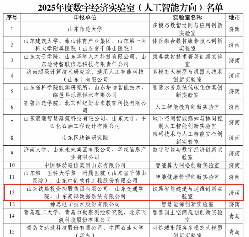 日前,山东省工业和信息化厅公布了2025年度山东数字经济创新平台名单,集团牵头申报的“铁路智能建造与运维创新实验室(人工智能方向)”成功入选,成为本次25家获批单位之一,标志着谈球吧在人工智能关键技术研究与创新应用方面迈出了坚实一步。