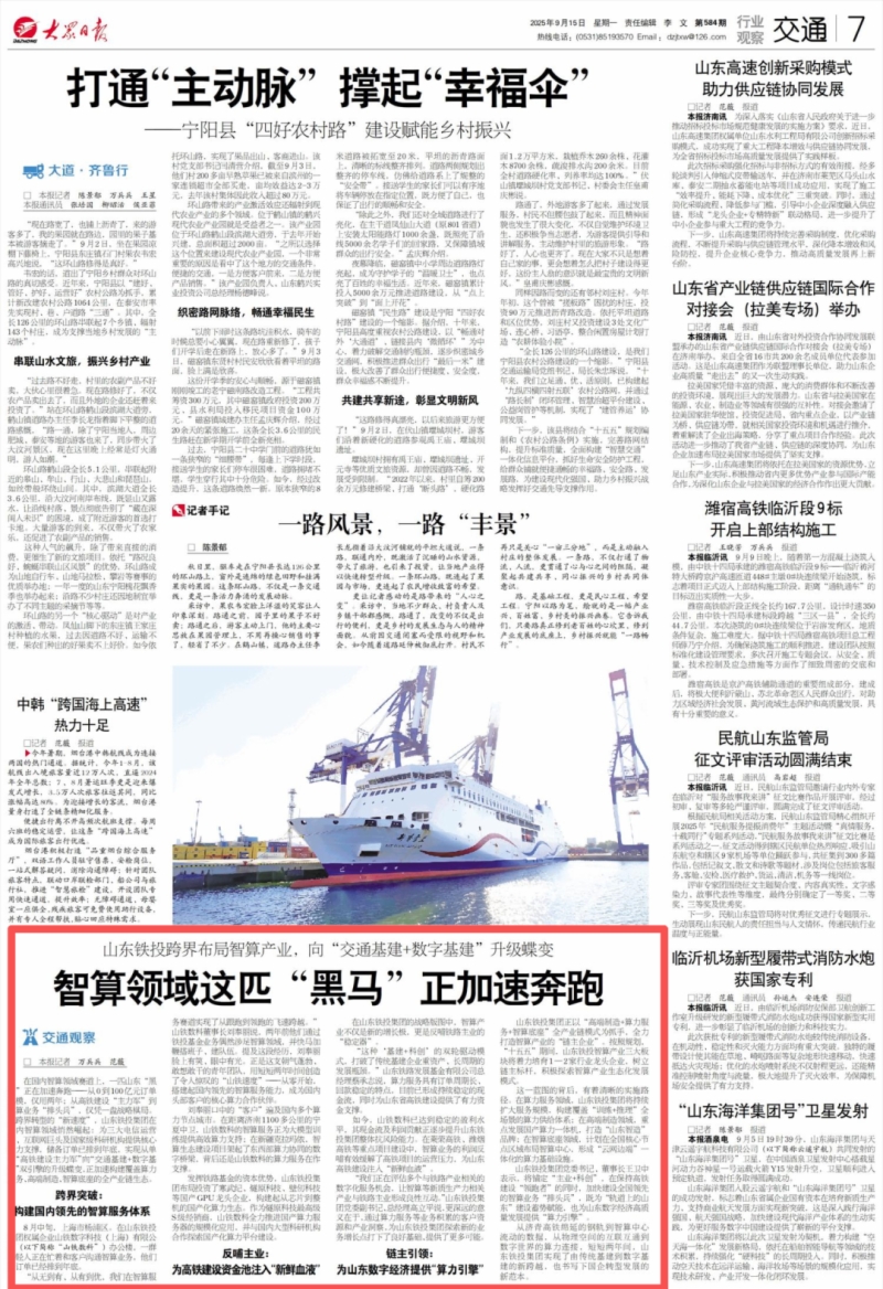 9月15日,《大众日报》7版交通版刊发《山东铁投跨界布局智算产业,向“交通基建+数字基建”升级蝶变——智算领域这匹“黑马”正加速奔跑》,专题报道谈球吧智算业务发展情况。以下是《大众日报》原文。
