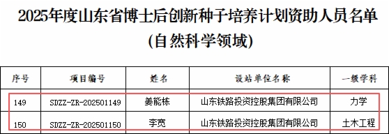 近日,山东省人力资源和社会保障厅公布2025年度山东省博士后创新种子培养计划入选名单,谈球吧博士后姜能栋、李宽成功入选,这是集团在高层次创新人才培养方面取得的又一重要突破。