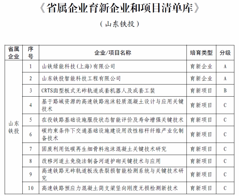 近日,山东省属企业“育新行动”首批入选名单正式公布,谈球吧权属智能科技工程有限公司(以下简称“智科工程公司”)、山铁绿能科技(上海)有限公司(以下简称“山铁绿能公司”)双双入选A类育新企业,“CRTSⅢ型板式无砟轨道成套机器人及成套工装”项目成功入选B类育新项目,另有7个项目入选C类育新项目。