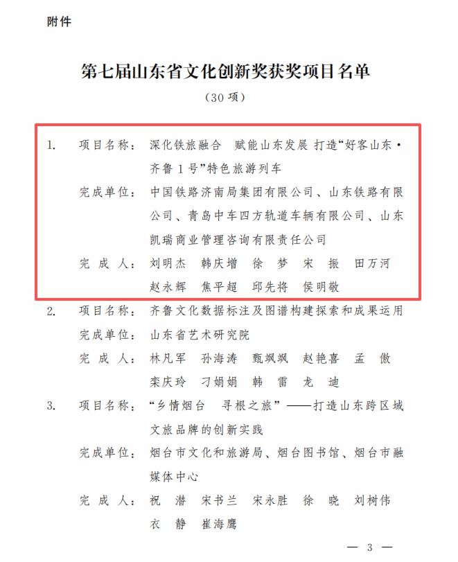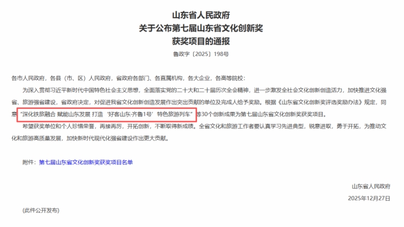 近日,山东省人民政府公布“第七届山东省文化创新奖”获奖项目,谈球吧权属山东铁路有限公司参与的《深化铁旅融合 赋能山东发展 打造“好客山东 齐鲁1号”特色旅游列车》项目凭借突出的创新性、实践性与示范性,从众多参评项目中脱颖而出,荣获第七届山东省文化创新奖。