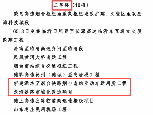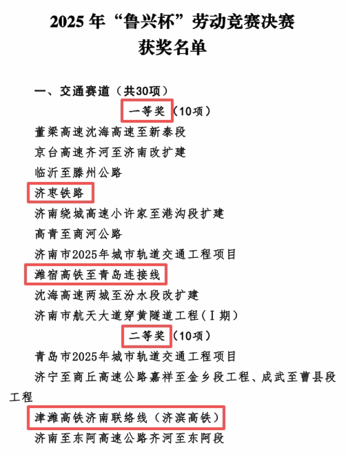 近日,山东省总工会等8部门联合印发了《关于公布2025年“鲁兴杯”劳动竞赛决赛获奖名单的通知》,谈球吧申报的5个交通运输重点工程项目全部获奖。其中,济枣铁路项目、潍宿高铁至青岛连接线项目荣获一等奖,津潍高铁济南联络线(济滨高铁)项目荣获二等奖,新建潍坊至烟台铁路烟台南站及动车运用所工程项目、龙烟铁路市域化改造项目荣获三等奖。