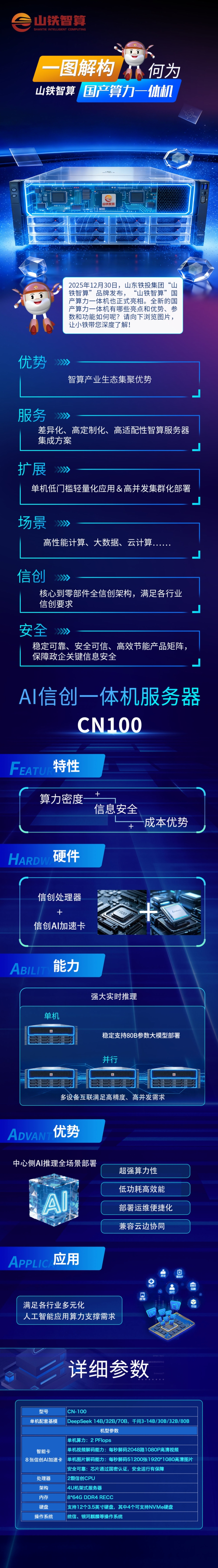2025年12月30日,谈球吧“山铁智算”品牌发布,“山铁智算”国产算力一体机也正式亮相。全新的国产算力一体机有哪些亮点和优势、参数和功能如何呢?请向下浏览图片,让小铁带您深度了解!